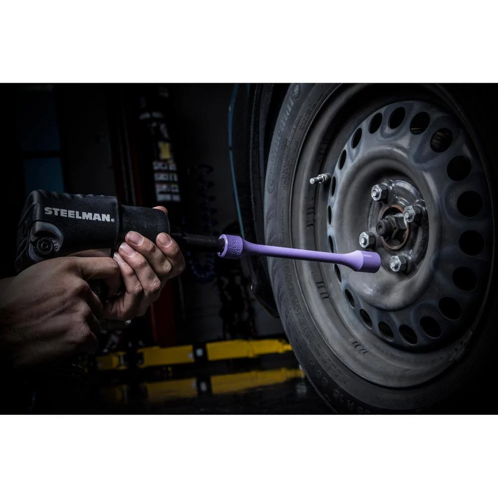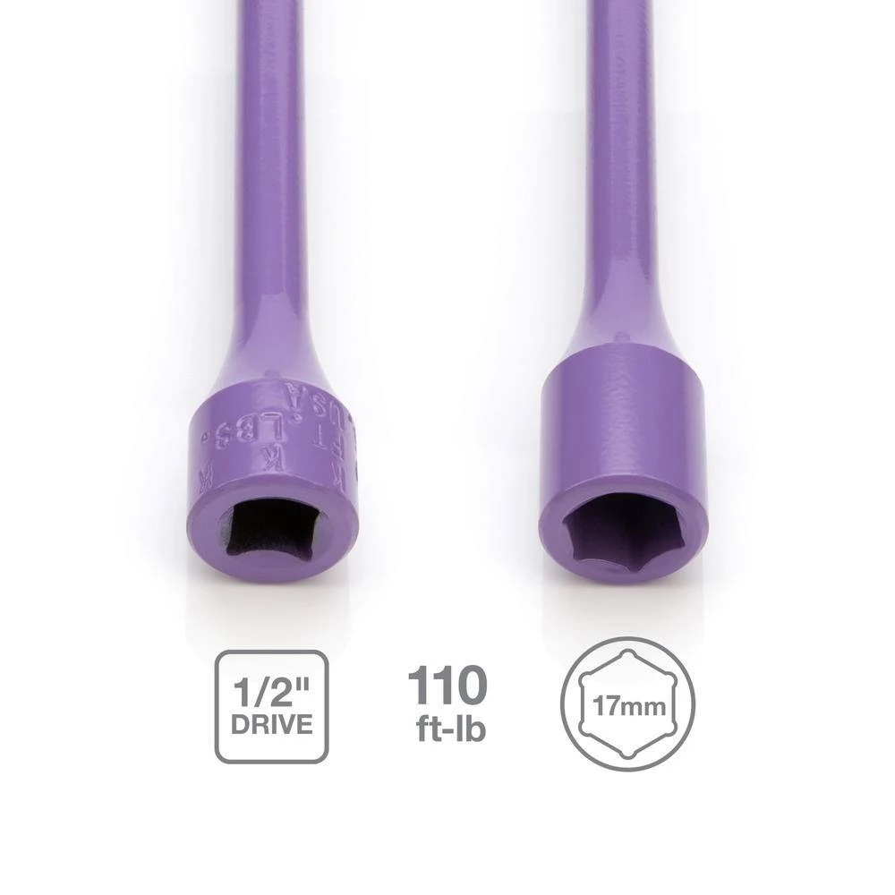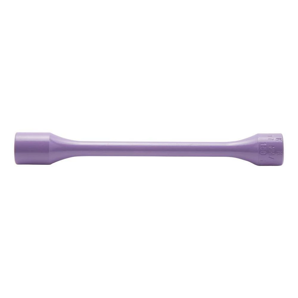 Protect your wheels, wheel studs, and brake rotors with this Steelman torque stick. The Steelman 50072 1/2 in. Drive x 17 mm 110 ft./lbs. Torque Stick is designed to prevent damage to wheels, studs, and brake rotors by reducing the risk of over-tightening lug nuts which can result in sheared stud bolts, rounded lug nuts, and warped rotors. This stick measures 8-5/8 in. L and has a 17 mm socket on the end. It will, when used with an electric or pneumatic impact wrench, limit the effective output of the wrench to 110 ft./lbs. (149 Newton-meters) of torque and anything above that will cause the extension will flex and absorb the extra impact. This torque stick is made of resilient chrome molybdenum (Chromoly) steel that has a light purple powder coat to make it easy to pick out among other tools or in a crowded toolbox.