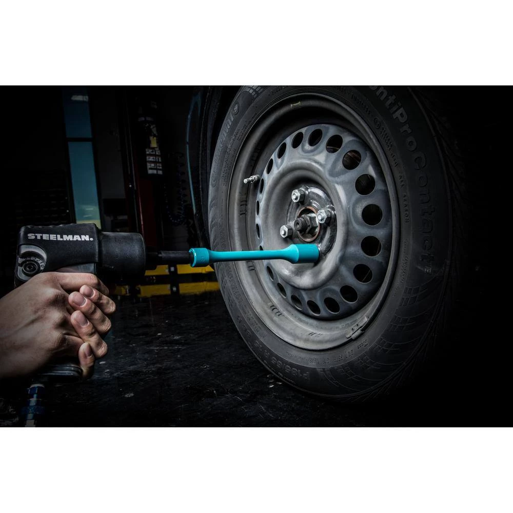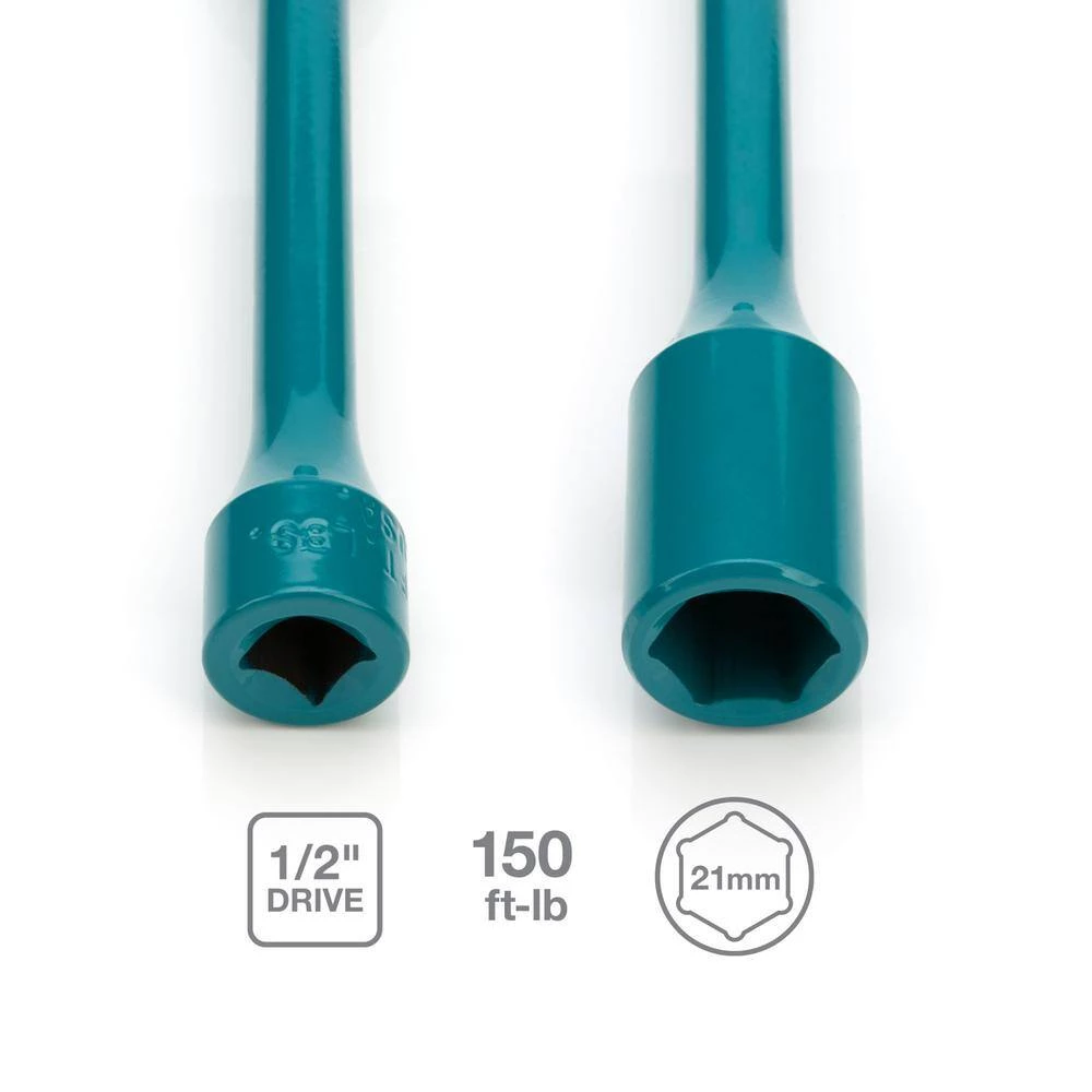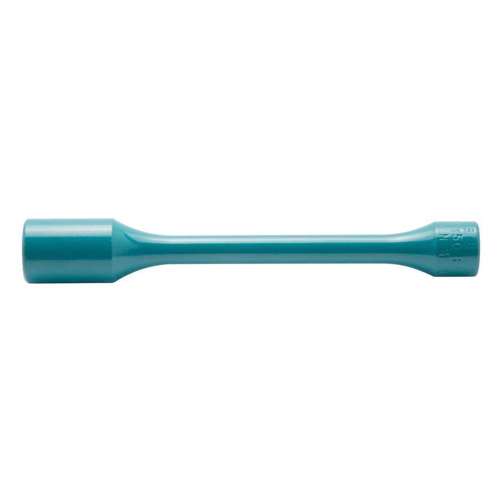 Protect your wheels, wheel studs, and brake rotors with this Steelman torque stick. The Steelman 50070-1 1/2 in. Drive x 21 mm 150 ft./lbs. Torque Stick is designed to prevent damage to wheels, studs, and brake rotors by reducing the risk of over-tightening lug nuts which can result in sheared stud bolts, rounded lug nuts, and warped rotors. This stick measures 8.6 in. L and has a 21 mm socket on the end. It will, when used with an electric or pneumatic impact wrench, limit the effective output of the wrench to 150 ft./lbs. (203 Newton-meters) of torque and anything above that will cause the extension will flex and absorb the extra impact. This torque stick is made of resilient chrome molybdenum (Chromoly) steel that has a turquoise powder coat to make it easy to pick out among other tools or in a crowded toolbox.