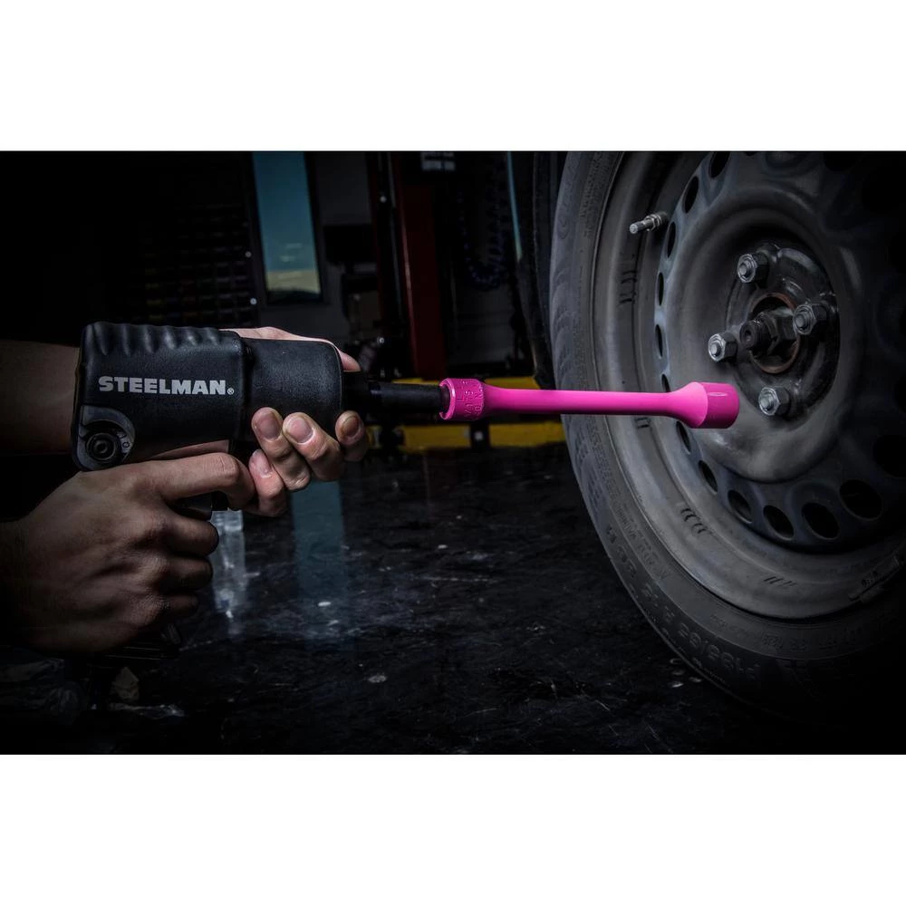 Protect your wheels, wheel studs, and brake rotors with this Steelman torque stick. The Steelman 50096 1/2 in. Drive x 22 mm 175 ft./lbs. Torque Stick is designed to prevent damage to wheels, studs, and brake rotors by reducing the risk of over-tightening lug nuts which can result in sheared stud bolts, rounded lug nuts, and warped rotors. This stick measures 8-5/8 in. L and has a 22 mm. socket on the end. It will, when used with an electric or pneumatic impact wrench, limit the effective output of the wrench to 175 ft./lbs. (237 Newton-meters) of torque and anything above that will cause the extension will flex and absorb the extra impact. This torque stick is made of resilient chrome molybdenum (Chromoly) steel that has a fuchsia powder coat to make it easy to pick out among other tools or in a crowded toolbox.