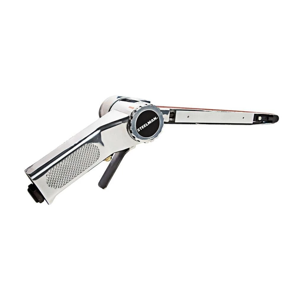 The Steelman 1612 1/2 in. (13 mm) Belt Sander is an ideal tool for auto repair work, weld prep and cleanup, sharp edge grinding and removal and more. With a maximum free run speed of 16,000 RPM this pneumatic tool uses a 1/2 in. x 24 in. (13 mm x 610 mm) 120-grit belt to will help you get the job done right and done fast. With a 360° rotatable head and extra long reach you can easily work in areas other pneumatic sanders can’t reach. The built-in regulator allows for consistent performance and the tool operates on 14.2 cu. ft. per minute of 90 psi compressed air. Exhaust is redirected back out through the handle away from your work area. Threaded to accept a conventional 1/4 in. NPT air inlet to connect it to a 3/8 in. air hose this tool is 24.5 in. L overall and weighs 2.55 lbs. Includes one 120-grit sanding belt.