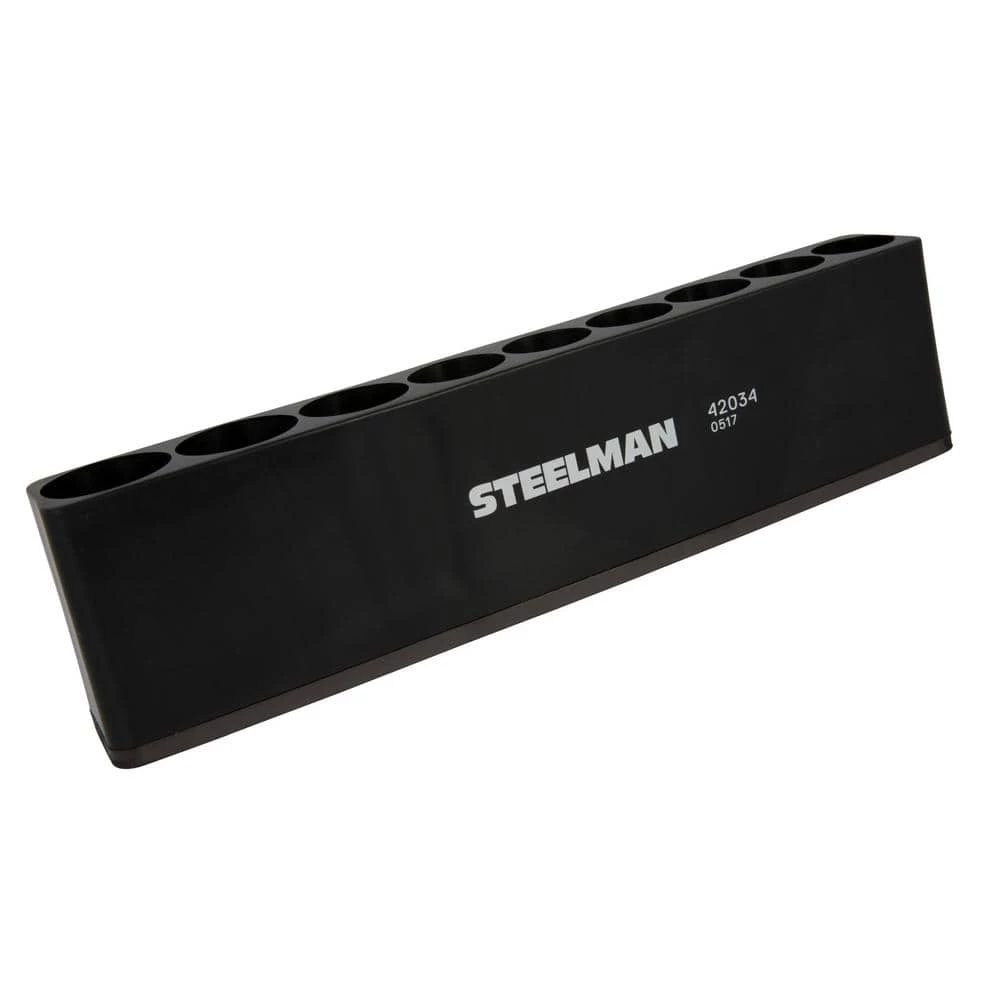 Keep all your 1/2-inch drive sockets organized with the STEELMAN 42034 magnetic organizer. The soft rubberized covering on the bottom of this organizer prevents damage to finished surfaces and does double duty by both allowing the holder to be mounted on any ferrous metal surface and keeping held sockets securely in place. The organizer is designed to hold a total of 9 standard/SAE and metric deep sockets. The durable plastic construction is oil and fuel resistant and the smooth surface is easy to wipe clean when soiled. In addition, the magnetic material used is non-transferrable and will not magnetize held sockets or surfaces/tools it comes in contact with.