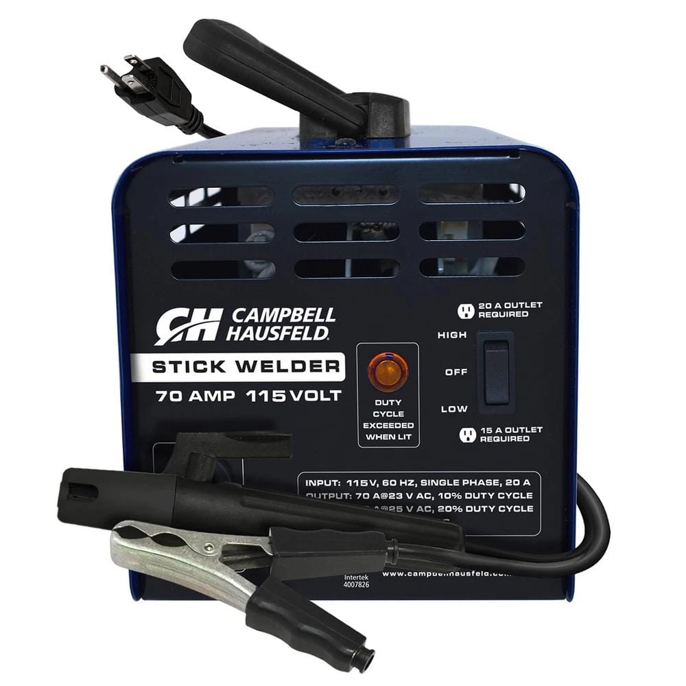 The Campbell Hausfeld 115-Volt stick welder (WS099001AV) is designed for home and shop applications. Easy to use and portable, this welder has a transformer design that provides an easy-starting, smooth arc. Weld with 1/16 in. electrodes on a 15 Amp household circuit; a 20 Amp circuit is required for welding with 5/64 in. electrodes. Thermal overload protection activates automatically to avoid overheating. Includes hammer/brush, starter pack of electrodes and hand shield. Duty cycle: 20% at 50 Amp, output 70 Amp. Weld and ground cable length: 6 ft. Finish your projects faster and easier with Campbell Hausfeld – The Air Power Expert.