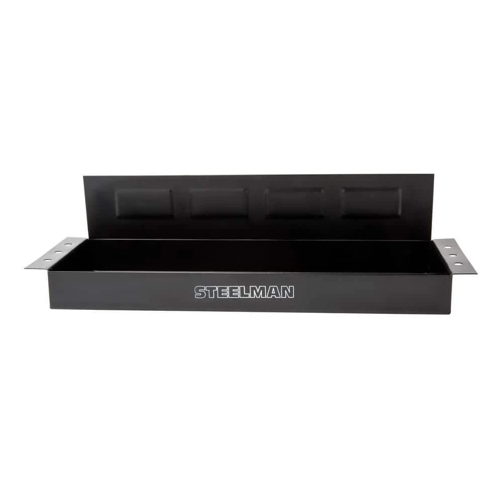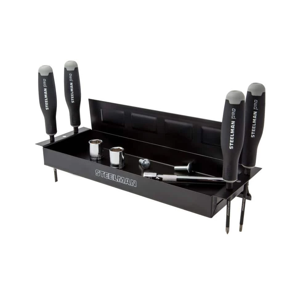 The STEELMAN 41810 Non-Marring Magnetic Parts Tray with 6 Screwdriver / Tool Holders is the ultimate in reliability and convenience.Thanks to four large magnets mounted to the back of the tray it can adhere to any ferromagnetic surface, instantly creating a versatile and convenient place to store and organize up to 7 pounds worth of small tools, parts, and accessories. Made from durable 20 gauge steel this tray features a large, open, 12-inch wide x 4.5-inch deep x 1.25-inch tall compartment for storage along with a flap to either side, each with 3 holes to hold up to 6 precision screwdrivers, picks, punches, or similar tools. A protective rubber coating covers the back mounted magnets and contact points to prevent damaging whatever the tray is attached to making these trays make a great addition to any home, garage/automotive shop, or classroom.