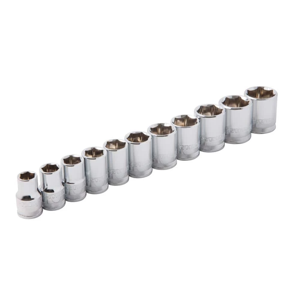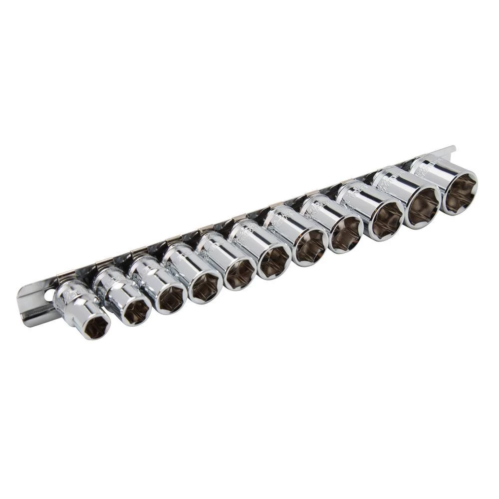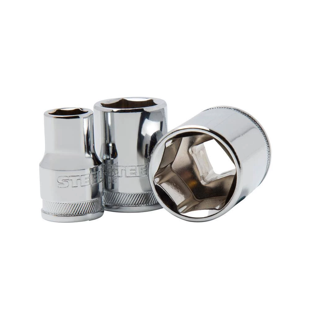 The Steelman 11-Piece 3/8 in. Drive Metric 6-Point Chrome Socket Set contains the following popular sizes: 9 mm, 10 mm, 11 mm, 12 mm, 13 mm, 14 mm, 15 mm, 16 mm, 17 mm, 18 mm and 19 mm Designed to apply maximum torque, the 6-point opening of each chrome socket snugly grips the flat sides of fasteners. A ball detent recess on the drive end helps hold the socket on ratchets, adapters, and extensions. Constructed of chrome vanadium steel for strength and durability, these sockets are safe from rust and corrosion by using a durable chrome-plated finish.