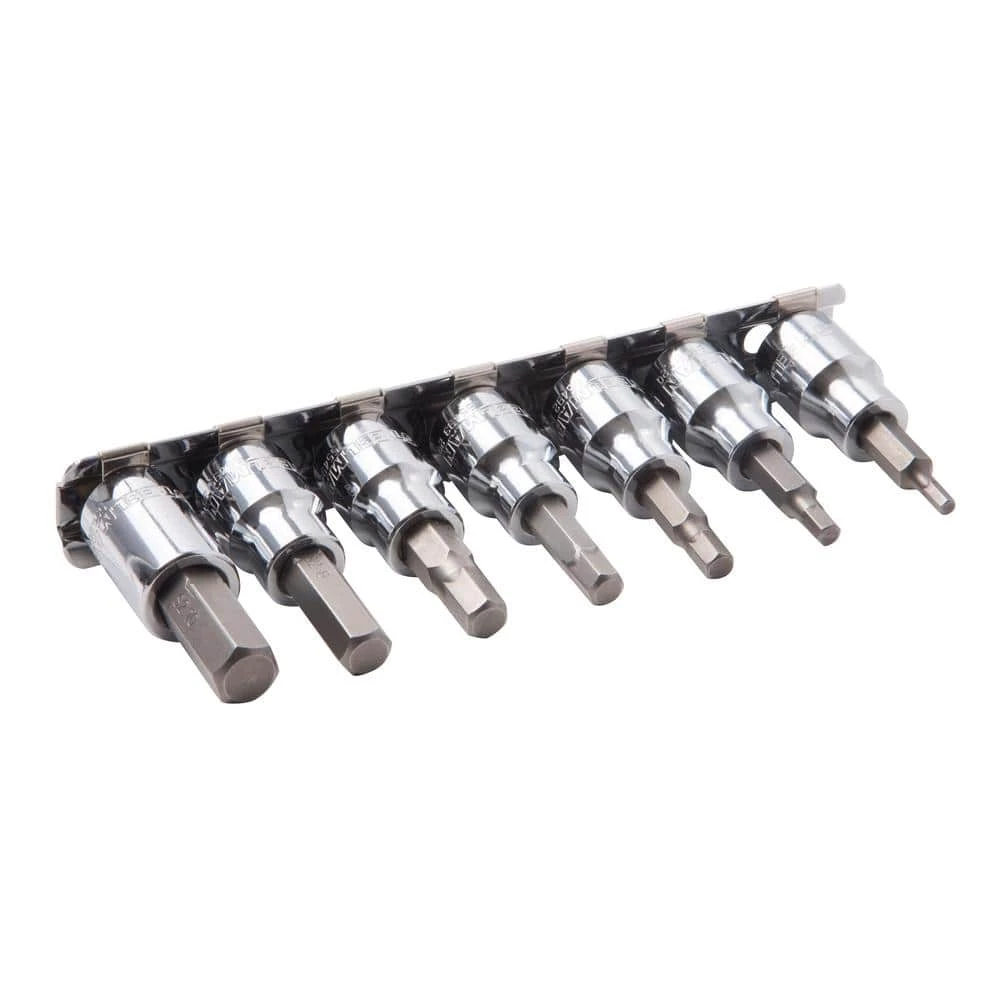 Whether you’re tightening brake calipers or assembling furniture, the Steelman 7-Piece 3/8 in. Drive Metric Hex Bit Socket Set delivers the dependable grip you need. Machined from high-strength S2 steel to prevent twisting and deformation of the socket under high loads, these sockets are designed for long-term service. The permanently stamped size markings are easy to read and won’t fade away. This set includes the following popular sizes: 3 mm, 4 mm, 5 mm, 6 mm, 7 mm, 8 mm, and 10 mm.