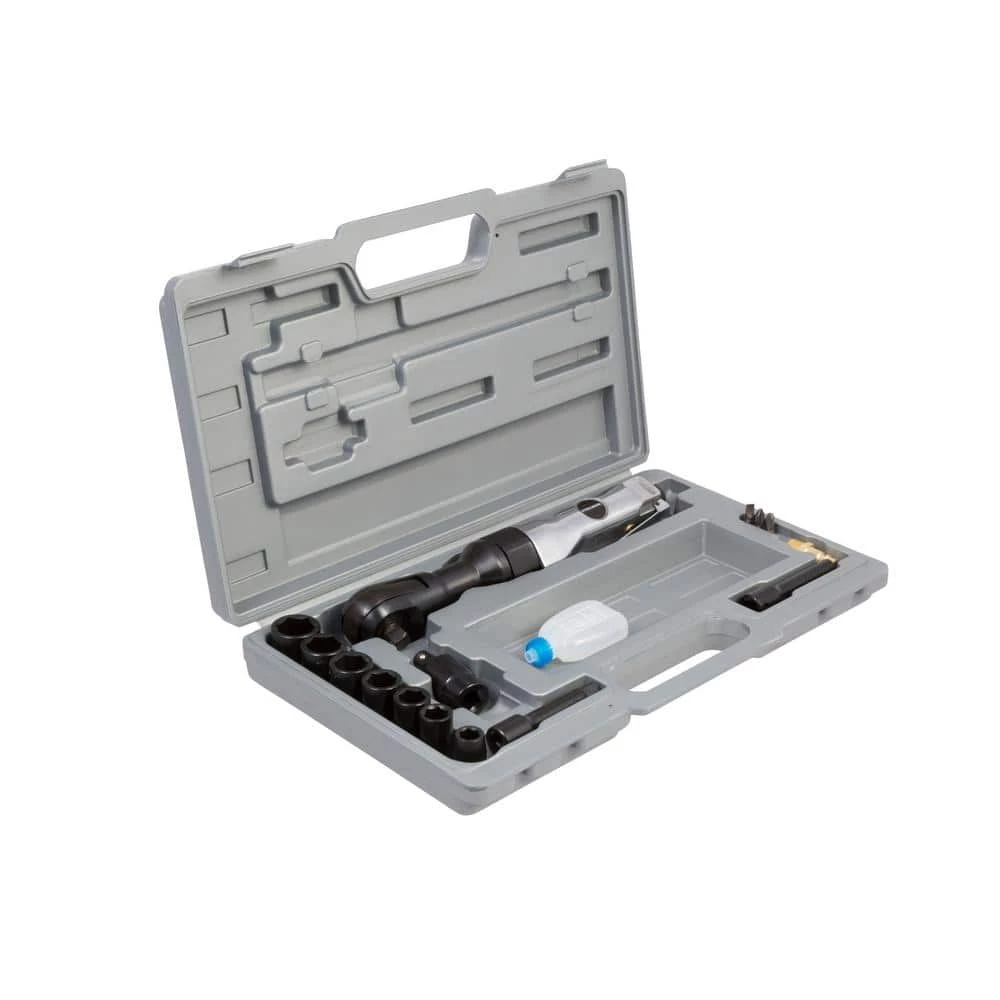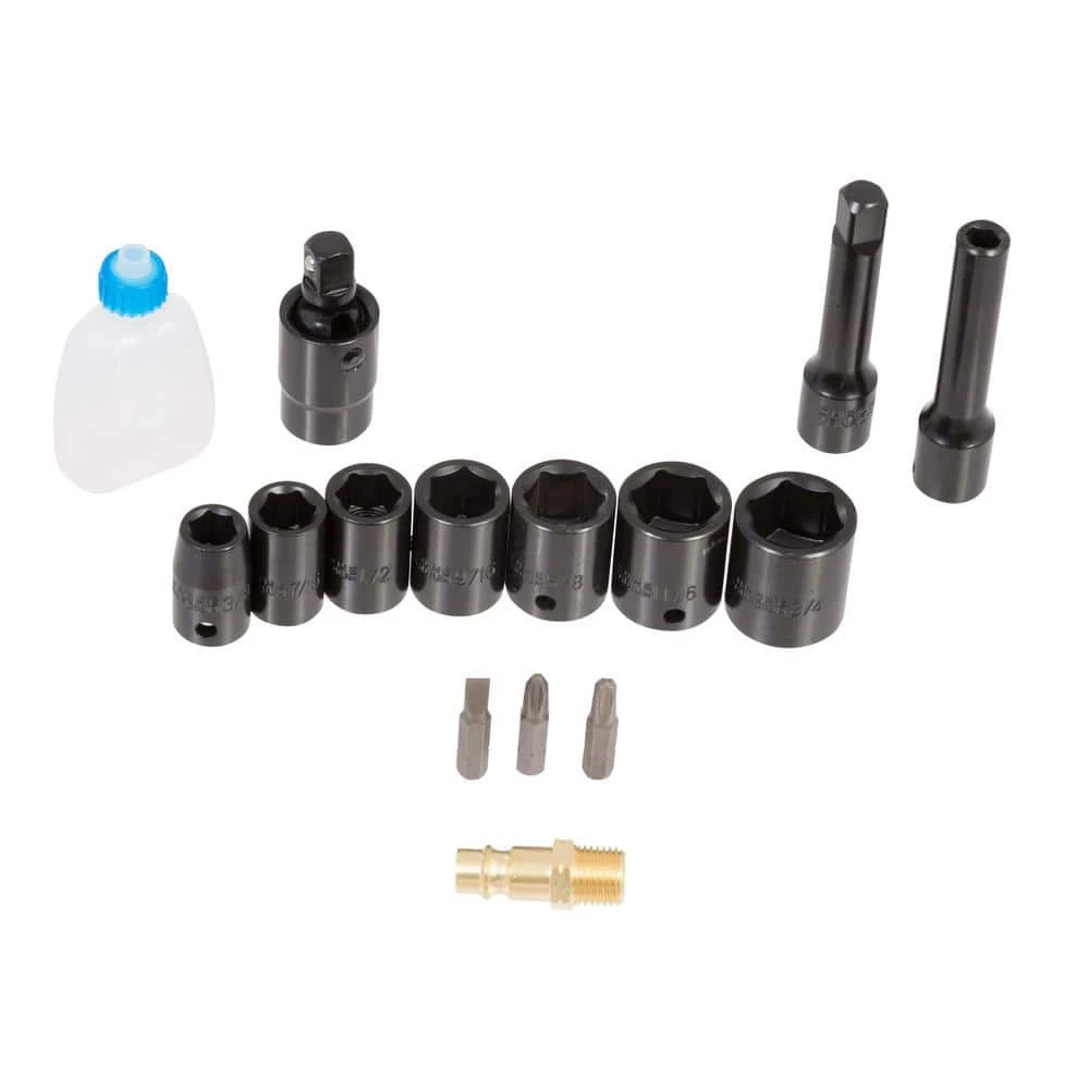 - 16-piece kit- contains the most common sockets and adapters as well as a bottle of air tool oil to keep your ratchet running smooth