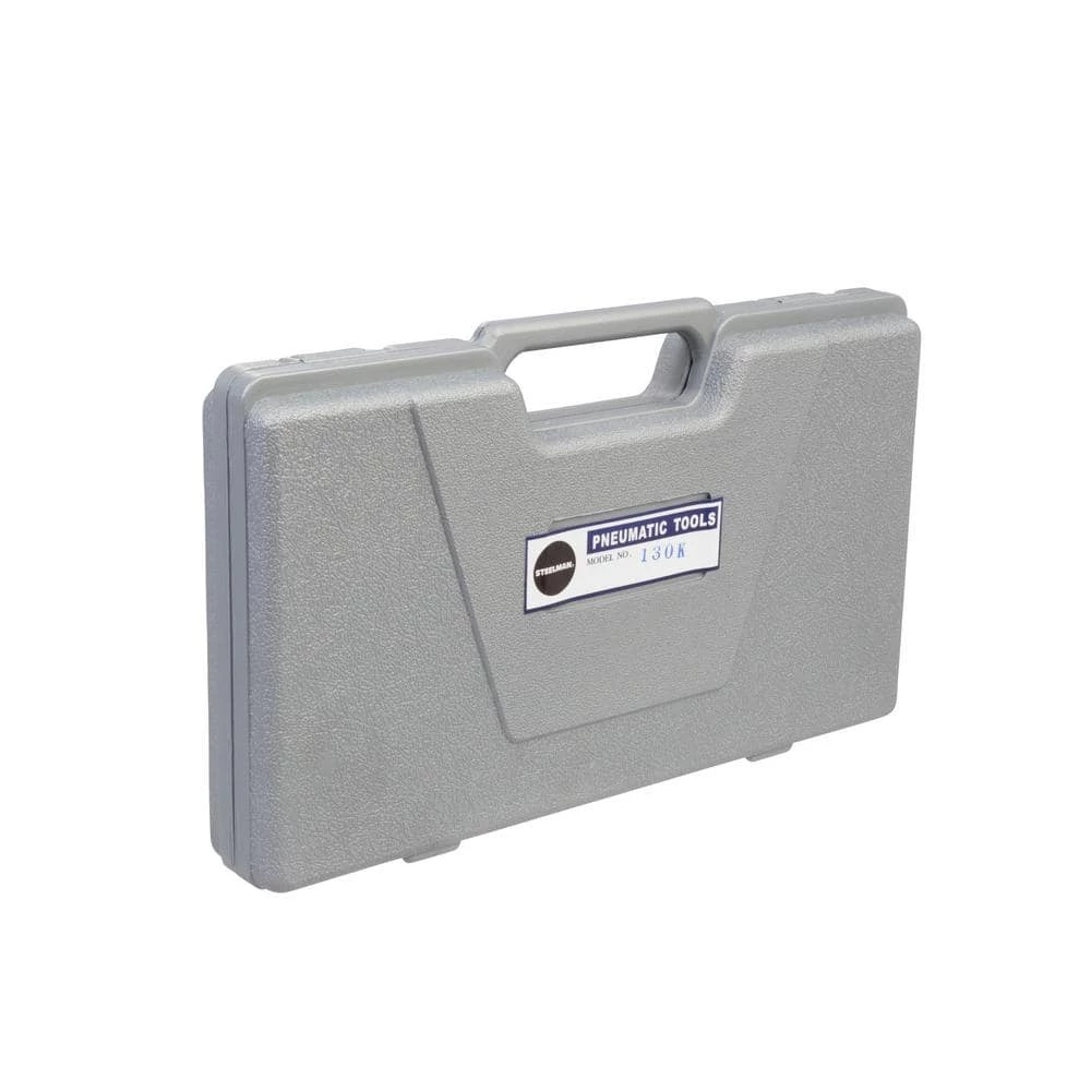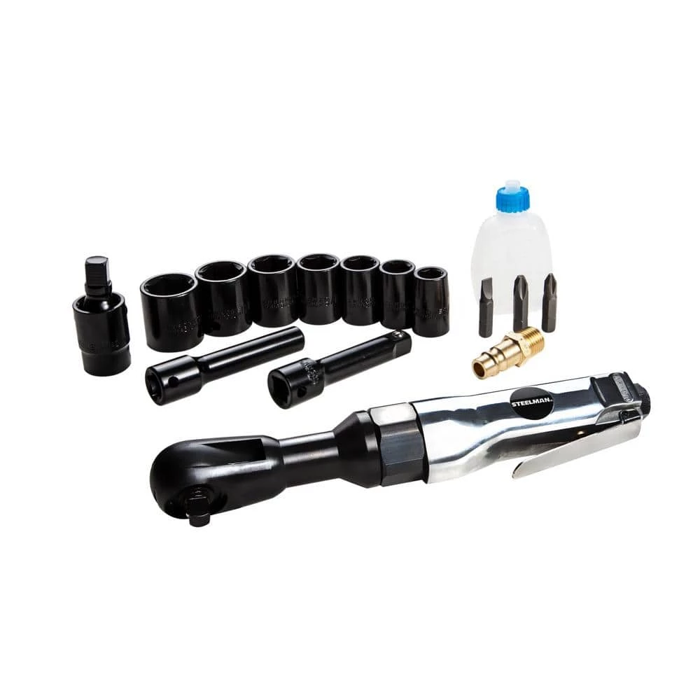 The Steelman 130K 3/8 in. Drive Air Ratchet Kit is a 16-piece set that contains the most commonly used sockets, adapters and accessories to both get you started working and keep you going strong. The lightweight yet sturdy 3/8 in. drive pneumatic wrench weights 2.75 lbs. and has a variable speed, lever-style throttle that provides smooth control with less hand fatigue. It’s powerful motor delivers 50 ft./lbs. of torque and 150 RPM of free run speed while using 4 CFM of compressed air. Included in the kit is a 1/4 in. NPT threaded male coupler to get your tool hooked up to your existing air compressor. The included heavy-duty impact sockets are made of durable chrome-vanadium steel and are sized 3/8 in., 7/16 in., 1/2 in., 9/16 in., 5/8 in., 11/16 in. and 3/4 in. Additional accessories include a 3/8 in. drive 3 in. extension bar, a 3/4 in. x 1/4 in. bit driver, a 3/8 in. swivel adapter, 3 drill bits – PH2, PH3 and 5.5 mm slotted and a bottle of air tool oil. To keep all these tools organized and ready for the next job, the entire kit comes in a blow-molded plastic case.