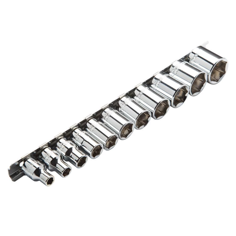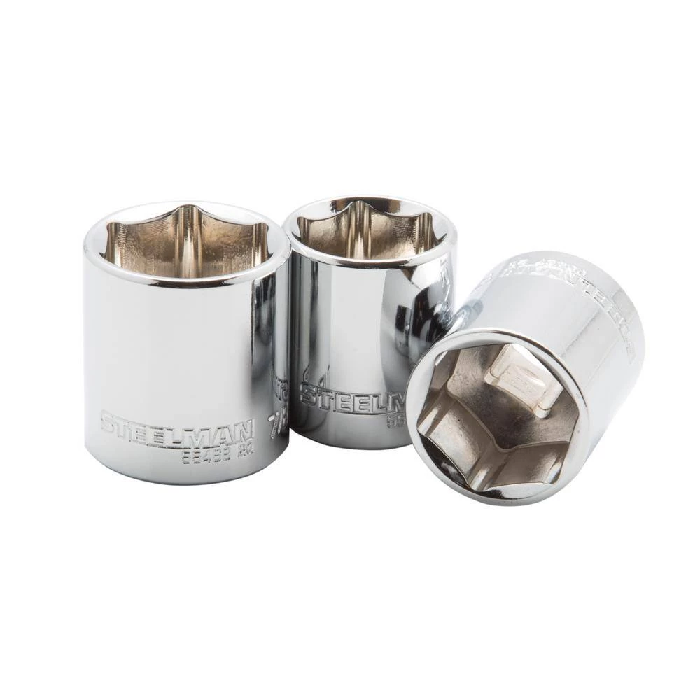 The Steelman 11-Piece 3/8 in. Drive SAE 6-Point Chrome Socket Set contains the following popular sizes: 1/4 in., 5/16 in., 3/8 in., 7/16 in., 1/2 in., 9/16 in., 5/8 in., 11/16 in., 3/4 in., 13/16 in., and 7/8 in. Designed to apply maximum torque, the 6-point opening of each chrome socket snugly grips the flat sides of fasteners. A ball detent recess on the drive end helps hold the socket on ratchets, adapters, and extensions. Constructed of chrome vanadium steel for strength and durability, these sockets are safe from rust and corrosion by using a durable chrome-plated finish.