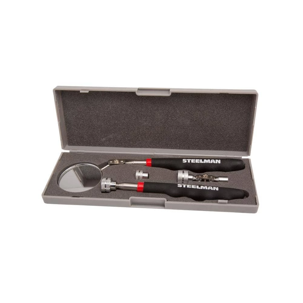 There are some things that always seem to go missing: that nut you just dropped, the last screw you had to put back, jewelry, the other sock, and keys are just a few to mention. We all have to deal with mismatched socks, but at least you can find and retrieve small items with the Steelman 41813 4-Piece Magnetic Pick Up and Inspection Tool Kit. Inside the included foam lined storage case is an articulating mirror and a magnetic retriever with 3 magnetic heads. The mirror extends from 9.75 in. to 36.5 in. allowing you to easily perform inspections on HVAC systems and look around automotive engine compartments and undercarriages, or use it around the house to look behind bookcases, under beds, and other hard-to-see places. The magnetic retriever extends from 6.75 in. to 25 in. and has 3 interchangeable heads with a 3.5 lbs. capacity, 8 lbs. capacity, and an 8 lbs. capacity atop an articulated arm so you can pick up small, easily dropped items like screws, nails, nuts, bolts, and other fasteners around the workshop and pins, keys, and other items around the house.