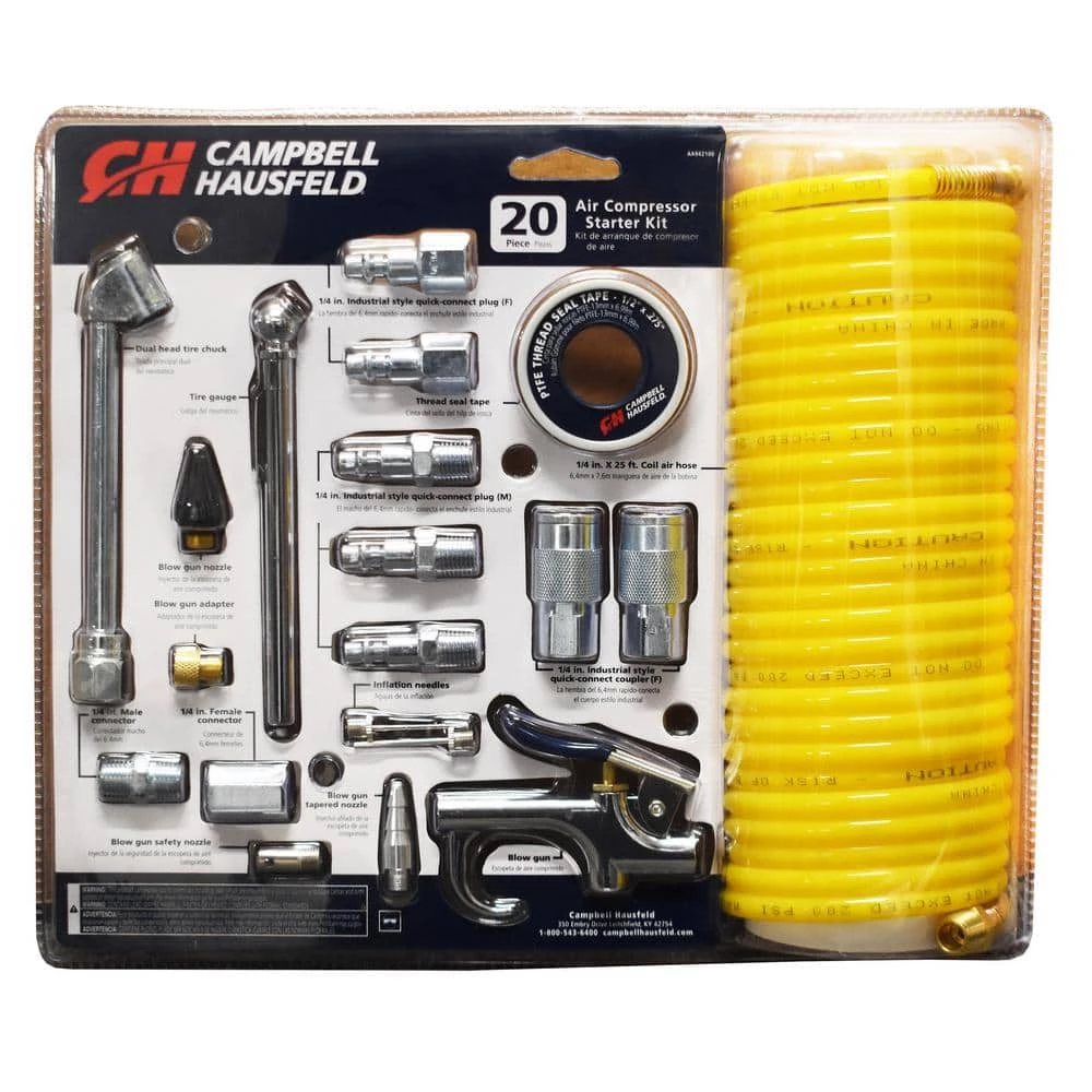 The Campbell Hausfeld 20-piece air compressor accessory kit comes with everything needed for inflating and basic air line set up. This 20-piece air hose kit is the ideal start for basic inflating of tires, sporting equipment, air mattresses and more. This kit includes a 1/4 in. x 25 ft. nylon recoil air hose, blow gun, two 1/4 in. industrial-style quick-connect couplers (F), a 1/4 in. connector (M), two 1/4 in. industrial plugs (F), three 1-4 in. industrial plug connectors (M), PTFE thread-sealing tape, dual-head tire chuck, tire gauge, blow gun nozzle, blow gun adapter, blow gun safety nozzle, blow gun tapered nozzle and 2 inflator needles.