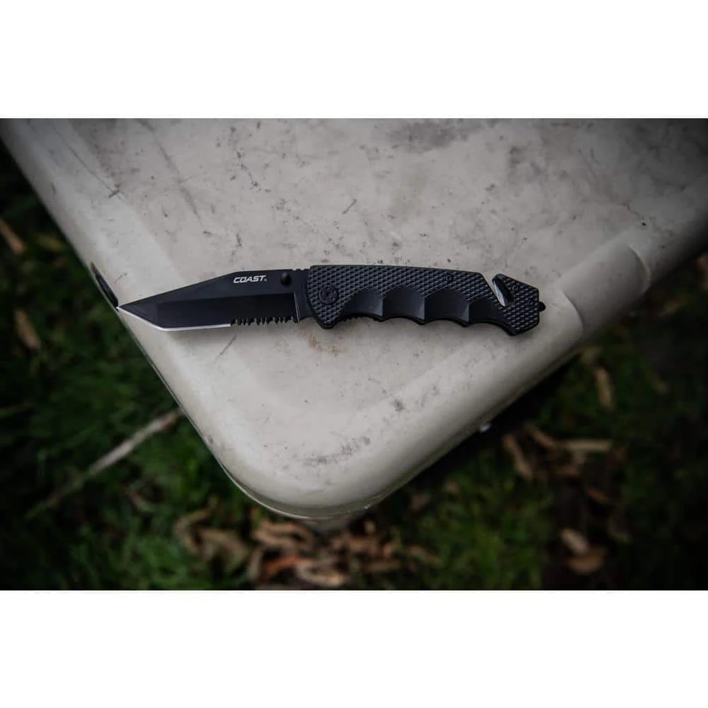 Grip-Textured nylon handles not only makes the DX330 Knife easy to hold, but it also gives it incredible strength and durability. Utilizing our Double Lock technology, anyone can work with confidence knowing that the added safety prevents the knife from accidentally closing. It easily opens with 1 hand using thumb studs on the blade, and you can always take it with you because of its deep-carry pocket clip. For added safety, the DX330 comes equipped with a seat belt cutter and a glass breaker. With Coasts commitment to quality, the DX330 Knife is backed by Coasts lifetime warranty against defects in materials and workmanship.