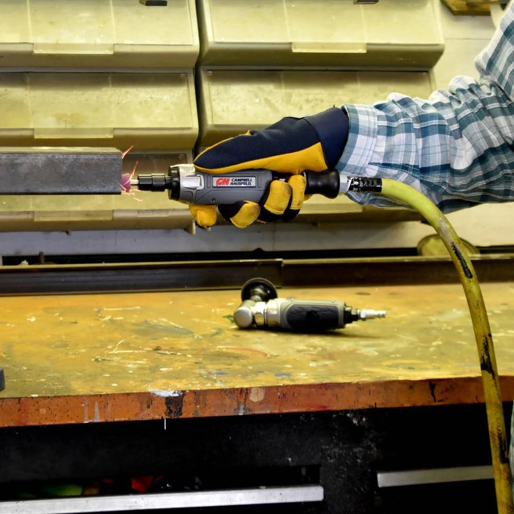 Work comfortably in tight spaces with this Campbell Hausfeld Get Stuff Done straight die grinder. It offers a rubberized, ergonomic comfort-grip. For efficiency, it features 25,000 RPM and a 0.2 horsepower motor. Multiple air flow adjustments provide easy control. Sturdy composite housing material ensures lasting use.