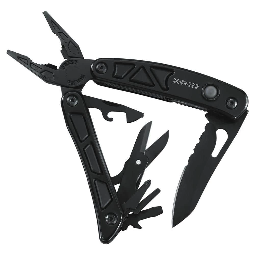 With 2 built-in LED lights to illuminate work surfaces, the LED155 LED Pro Pocket Pliers multi tool is great for working on the car, under the sink or other tight spaces where light is needed. A full size 3Cr13 stainless steel blade is easy to sharpen while still holding a great cutting edge and a liner lock keeps the blade securely in place when open. Sure grip rubber handle inlays provide a firm and comfortable grip. Stainless steel construction ensures that this tool will provide years of worry free use. Backed by Coast’s lifetime guarantee against defects in materials and workmanship.