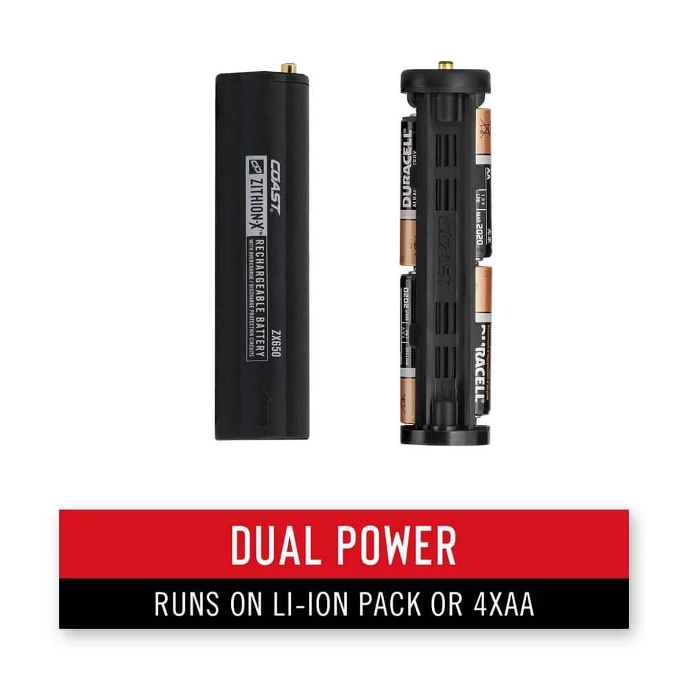 - ALKALINE DUAL POWER: Each COAST Alkaline-Dual Power product comes with COAST Extreme Performance alkaline batteries and is compatible with other standard alkaline batteries. Each product can also be powered with a COAST ported ZITHION-X rechargeable battery. This offers you the convenience of alkaline and the cost efficiency of rechargeable battery.