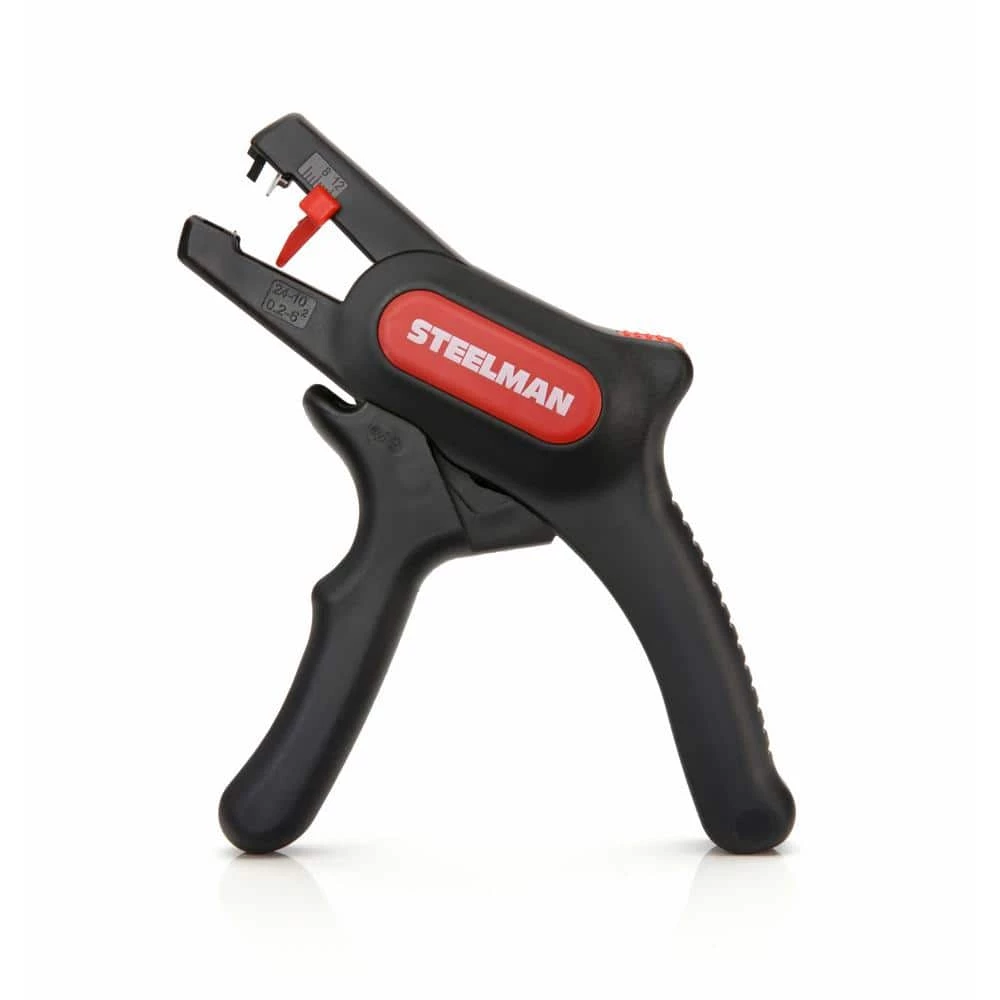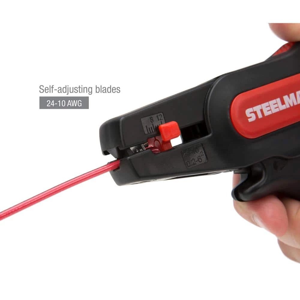The STEELMAN 41865 Self-Adjusting Pistol Grip Wire Stripper and Cutter is a fast, one handed tool that is perfect for cutting and stripping wires in tight areas. The lightweight, ergonomic design is equally comfortable for right and left handed users and works with a single squeezing motion. The main body of the tool is made from nylon reinforced fiberglass but the blades are made from hardened steel and can handle all kinds of wire-solid, multiple, and fine stranded. The self-adjusting wire stripping blades automatically select the proper position for the size of wire inserted and is able to handle wires from 24 to 10 AWG in size. The cutter works with the same squeezing action and can cut wires up to 14 gauge diameter with a single action.