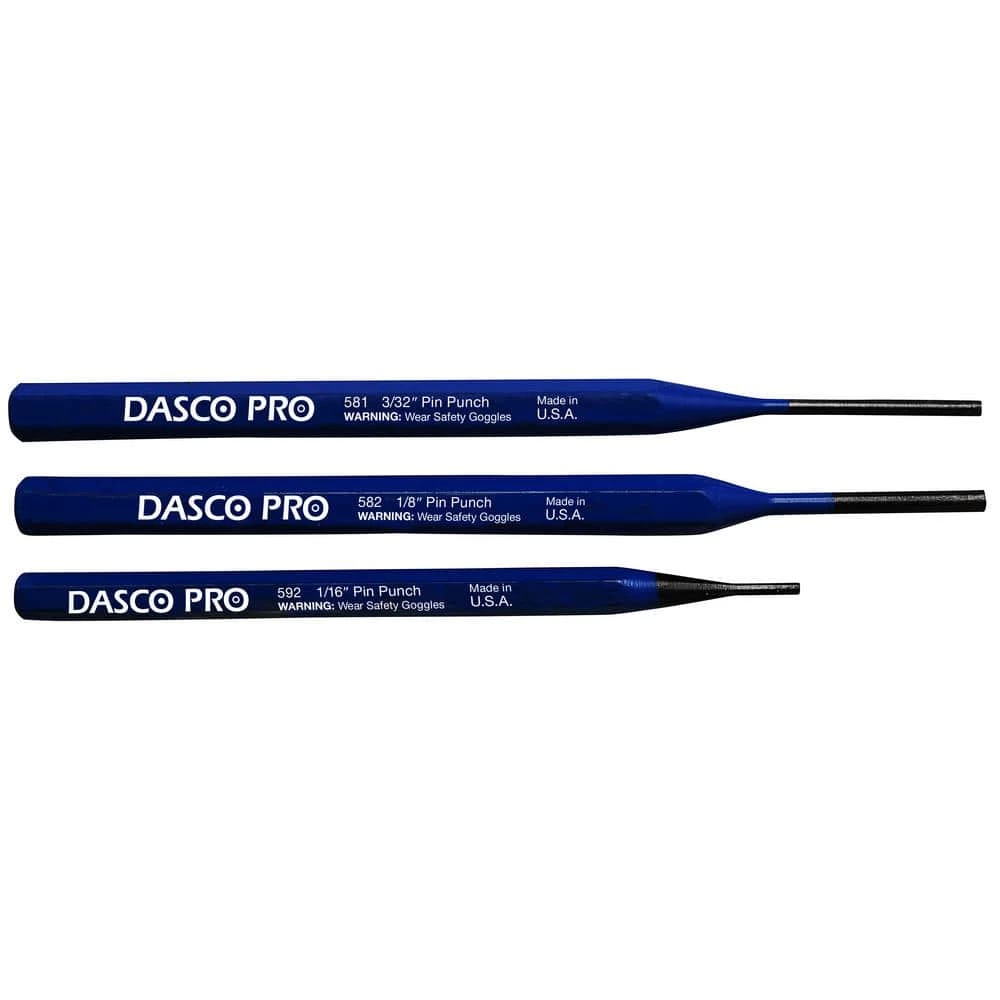 The Dasco Pro 3-Piece Small Pin Punch Kit has punches used for removing pins, keys, rivets and other alignment parts. Their hexagonal stocks keep them from rolling off flat surfaces when not in use. Made in USA.