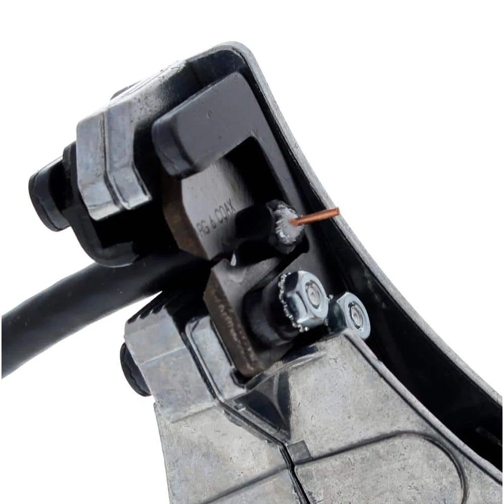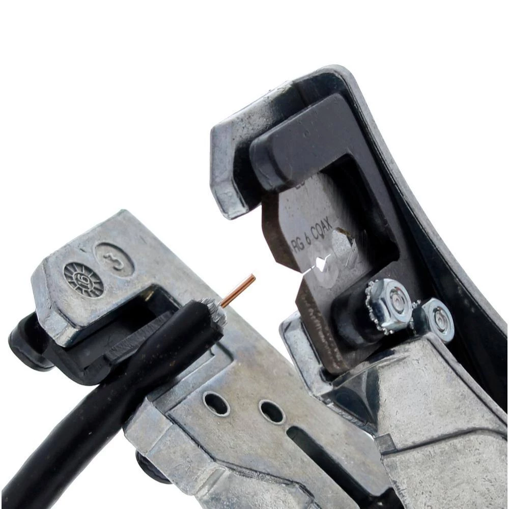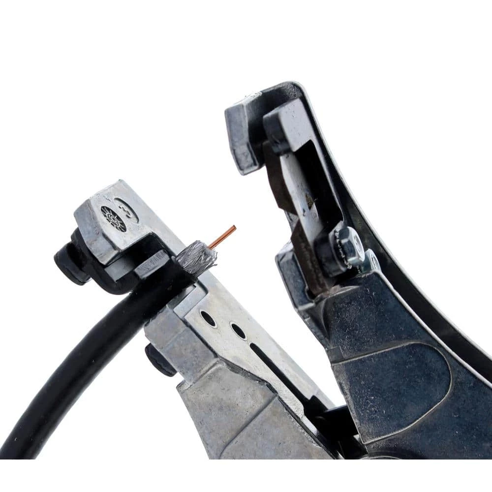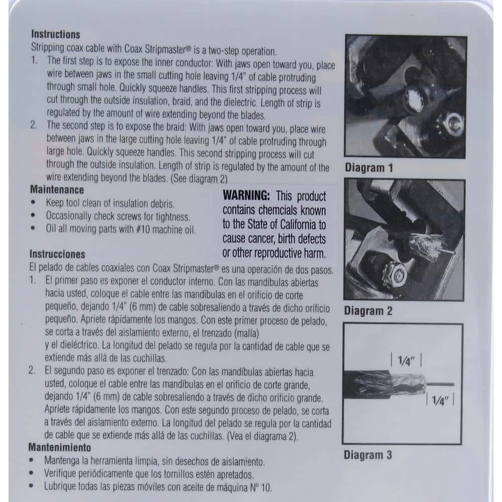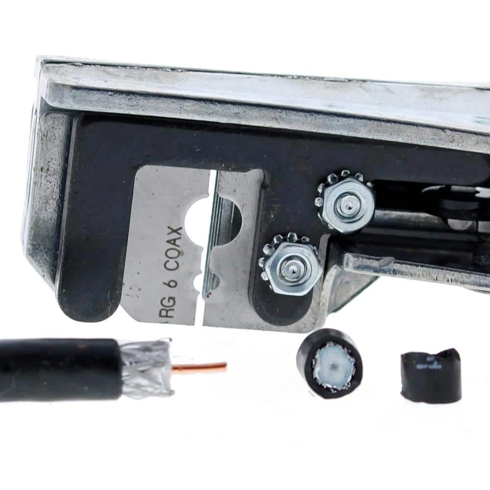 Coax Stripmaster for RG-59 coax cables. Each tool includes the standard Stripmaster tool frame and knife type blades for 2-step stripping of RG-6 coaxial cables. The Stripmaster tool allows the user to strip 1-level at a time, and the user can determine the proper strip length between levels.
