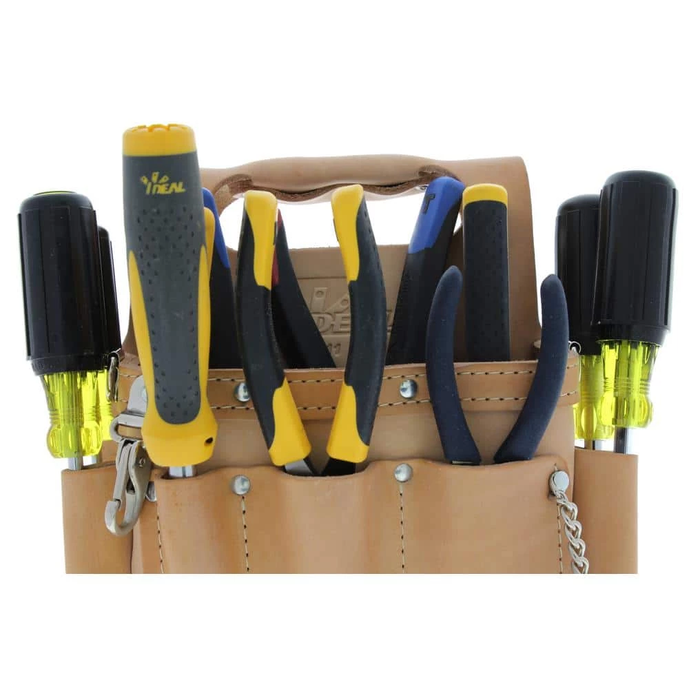 Tuff-Tote Tool Pouches from Ideal are made of leather and include 8-pockets and a belt-mounted pouch for vast storage. The pockets include a large utility compartment with 2 dividers and 6 screwdriver loops and 7 outer pockets. The Tuff-Tote Tool Pouches feature release snaps and tape chain, in addition to a leather grab handle for carrying comfort.