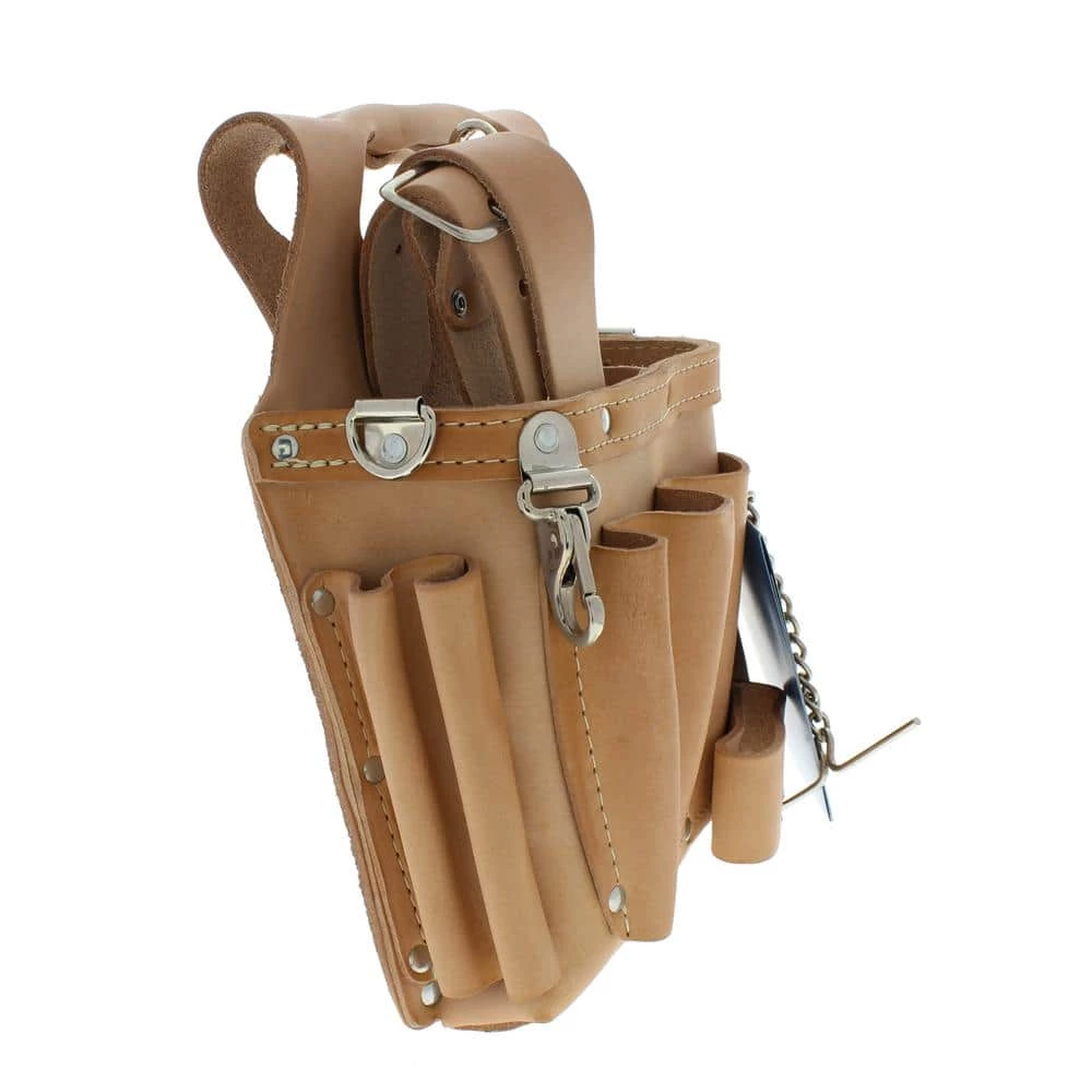 - 8-pocket, belt-mounted pouch features large utility compartment with 2 dividers and 6 screwdriver loops, 7 outside pockets, release snaps and tape chain