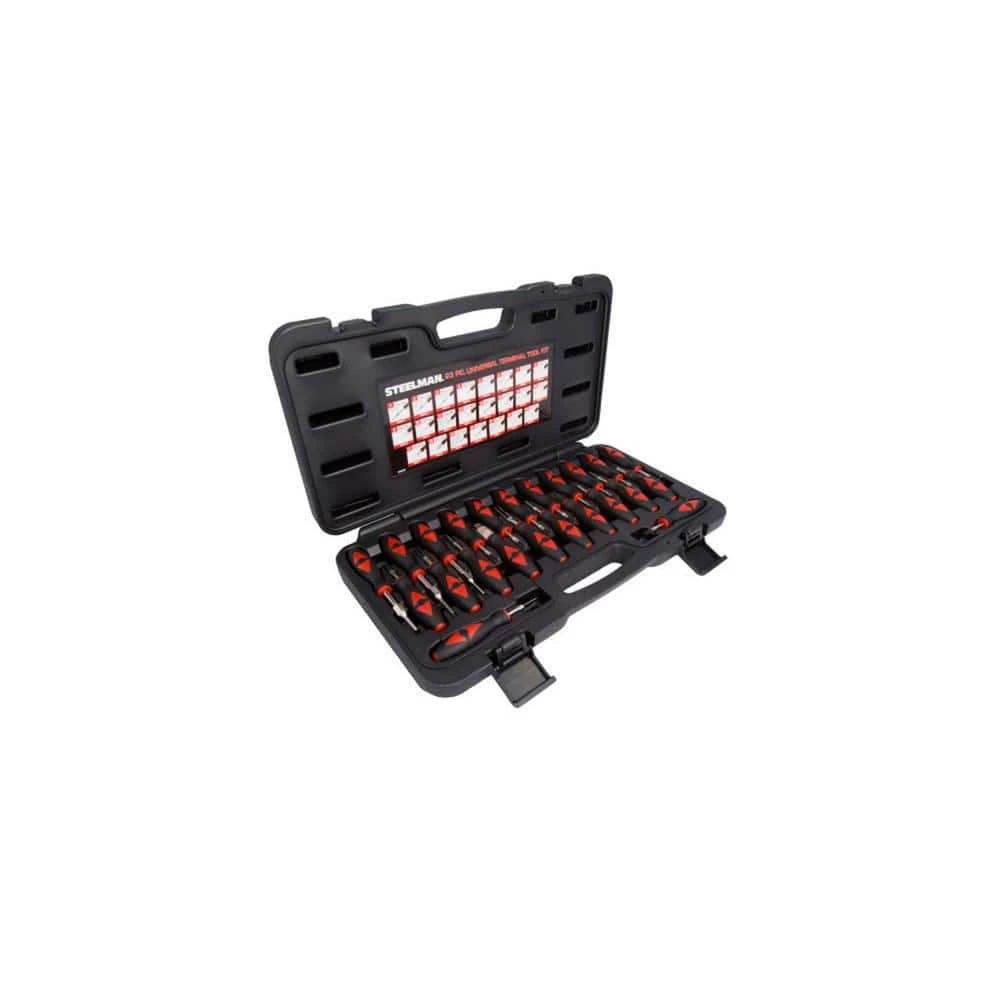 As many technicians know, automotive electrical terminal blocks are designed to hold wires amid the bumps and vibrations experienced in modern cars and trucks and not let go or loosen so when it comes time to replace or repair those blocks or wires, they never want to let go and special tools are needed to separate them. The STEELMAN 95839 23-Piece Universal Terminal Tool Kit was designed to do just that, to let you separate the wires from their terminal blocks without causing damage to either. These connector pin release tools are made with non-magnetic stainless steel tips on chrome-plated hollow brass shafts mounted in comfortable TPR layered polypropylene handles. The tools included in this kit will work on terminals found in a wide variety of BMW, Volkswagen, Audi, Jaguar, Porsche, Saab, Skoda, Ford, Renault, Citroen, Chrysler, Fiat, Honda, Mazda, Mitsubishi, Toyota, Seat, and Opel vehicles. A convenient application reference chart listing tool shapes, sizes, and compatible manufacturers is included inside the blow-molded plastic storage case.